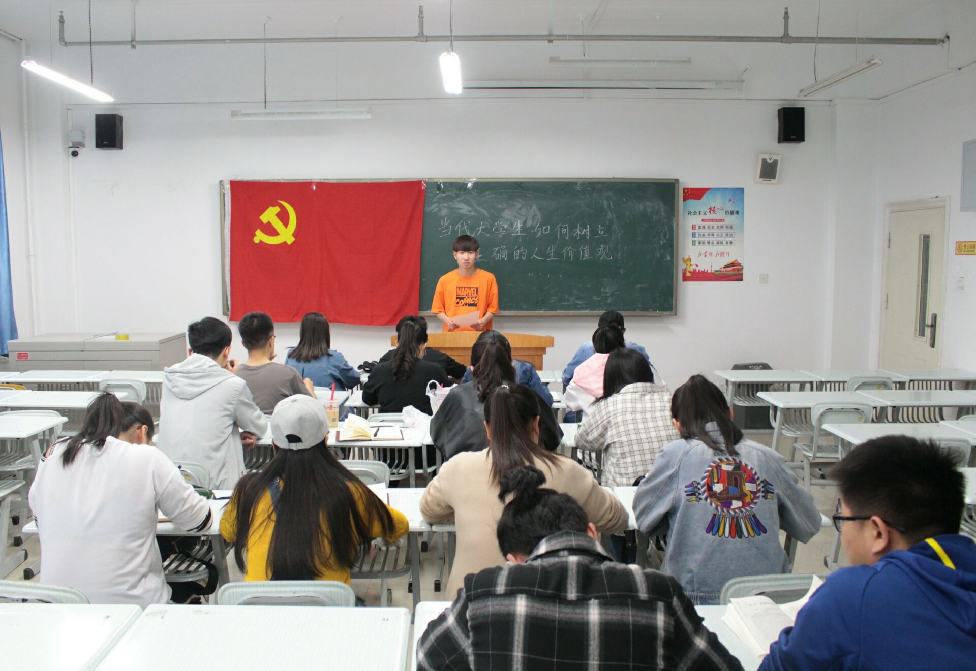 讨论分两组,17级新闻学一班与17级数字出版班、17级播音主持班为一小组,17级新闻学二班与17级广播电视学班、17级影视编导班为二小组。讨论首先从组内讨论开始,大家积极讨论交流自己对正确树立人生价值观的看法。然后,将每一个小组成员的看法和观点记录下来,再由两个小组的发言人各自发表自己小组的看法。最后讨论在负责人的总结后结束。